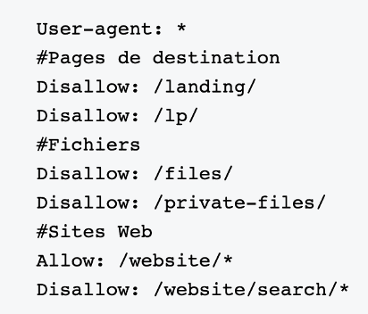 Il est possible d’y lister les différents moteurs de recherche, puis de leur autoriser l’indexation des pages que vous jugez pertinentes (“allow”). À l’opposé, on peut le leur interdire pour d’autres (“disallow”). Les crawlers disposent d’un quota de pages à explorer; si votre site possède de nombreuses pages, en faire le tri permettra au crawler de se concentrer sur vos pages les plus importantes.