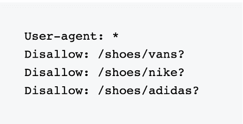 Optimisez votre fichier robots.txt pour que les crawlers le comprennent vite. Par exemple, au lieu de lister tous les contenus du même format à ne pas indexer, regroupez-les en les désignant par un astérisque. Dans l’exemple ci-dessous, on évitera de faire la liste des pages “shoes” par catégorie de marque (image 1). Indiquez plutôt que toutes les marques des pages “shoes” sont concernées, avec un astérisque (image 2) :